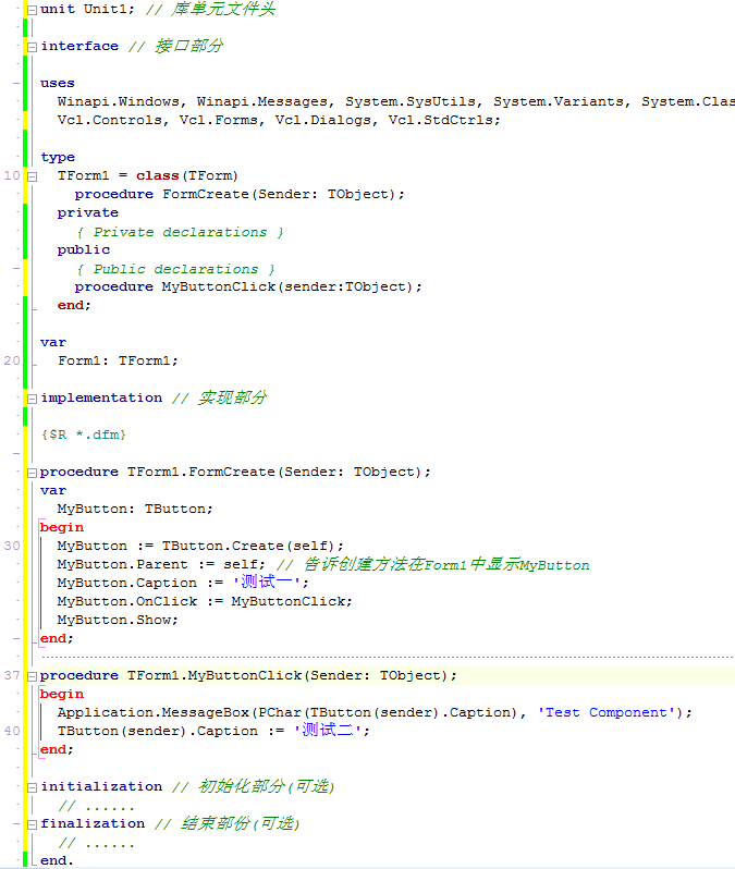 implementation部分分为两部分。一部分是声明部分,包括单元引用、常量、类型、变量、过程和函数的声明,这一点和interface部分相似。