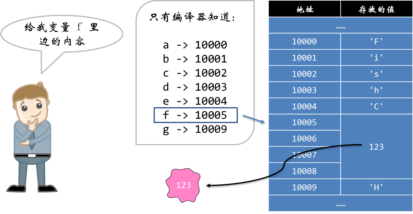 通过变量名对变量进行访问和存储是为了方便程序员而设计的,其实在内存中完全没有存储变量名的必要。因为编译器知道具体每一个变量名对应的存放地址,所以当你读取某个变量的时候,编译器就会找到变量名所在的地址,并根据变量的类型读取相应范围的数据。