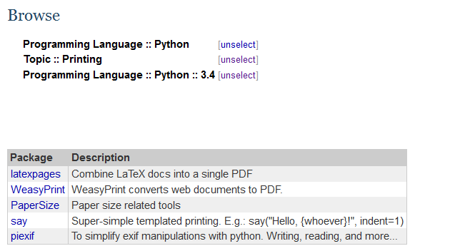 注意:三方类库支持 Python版本 是否与当前你开发环境是否一致;若不知道库的名称,可 Browse packages 浏览对应的库,如下示例:Python 3.4 版本 有关 Printing 的库