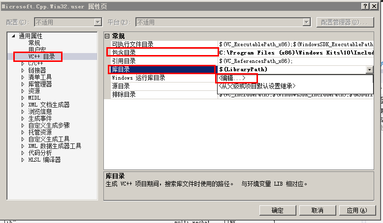 3.在弹出的属性页中,点击左侧的"VC++ 目录",分别选择"包含目录" 和 "库目录" 右侧的下拉箭头,然后点击"编辑" ,从而修改环境变量。