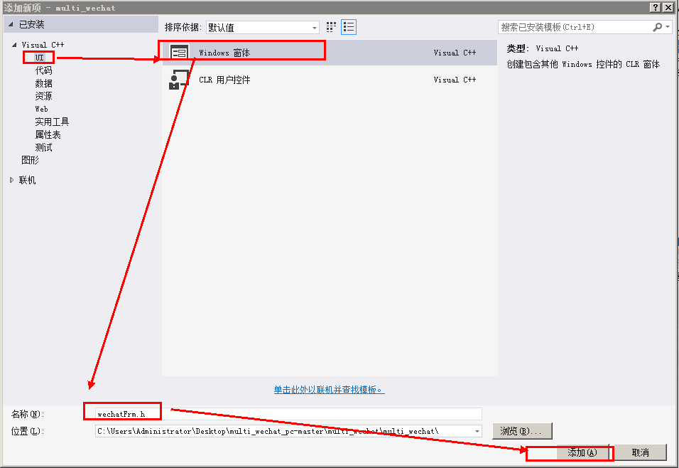 VS2010以及以前的版本,创建项目时都可以在CLR下找到“Windows窗体应用程序”的项目模板,但是VS2012以后的版本就没这么方便了。可以通过打开旧版本的项目来修改,也可以像下面这样操作: