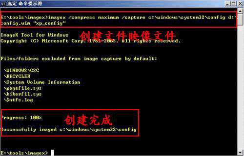 ImageX不仅可以备份整个分区,还可以有选择地备份文件夹,比如我们备份C:\Windows\system32\config即系统配置文件夹,就可以在命令行下输入命令imagex /compress maximum /capture C:\WINDOWS