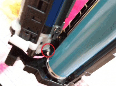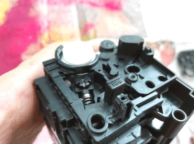 第五步:这个时候就要把废粉仓和加粉仓分离了,一定要注意另外一边的这个卡扣,它是另外一边齿轮的。我也不知道容不容易断,我没有弄过断的。