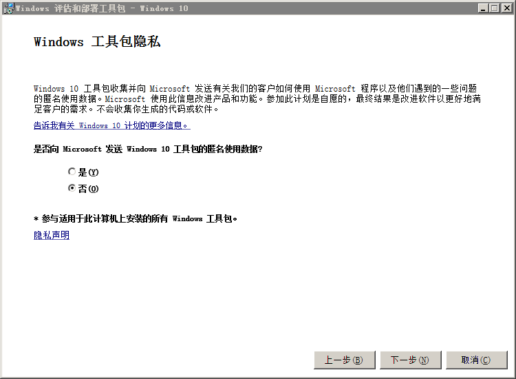 点击“下一步”转到“Windows工具包隐私”界面,根据你的想法选择“是”或“否”均可。