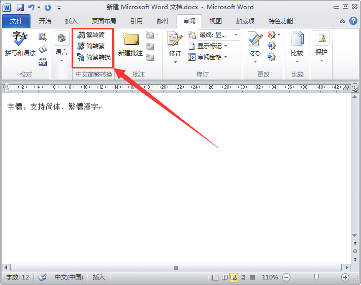然后点击word上方功能区域的“审阅”,打开审阅的功能选项卡,在里面进行相关的操作,即可到达简体字和繁体字的相互转化。