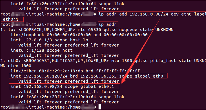 例子:ip addr add 192.168.0.98/24 dev eth0 label eth0:1
