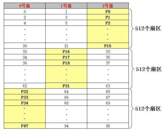 每块物理盘的条带都有一个编号,为了对应关系的明确,我们把条带编号也定义为从0开始,每块物理盘的第一个条带都称为0号条带,或者0号块,然后顺序往下编排。