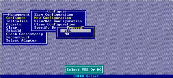 选择“Configure”下的“New ContioUration”,开始一个新的配置。如果原先己经配置过RAID,新的配置将会破坏原有配置,所以系统会询问是否继续,如图1-5所示。