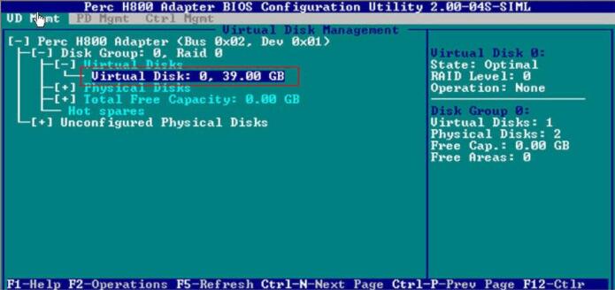 9、在此界面,将光标移至图中Virtual Disk 0处,按F2键可以展开对此虚拟磁盘操作的菜单。