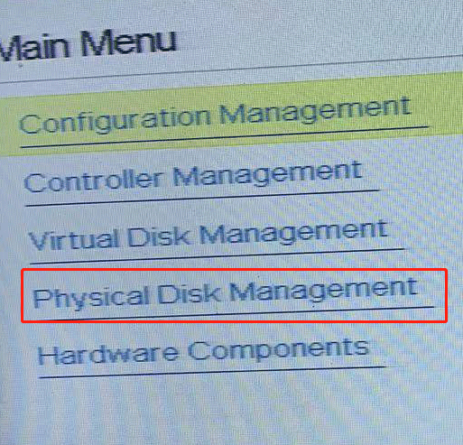 3. 进入到阵列卡设置主界面 选择 "Physical Disk Management"