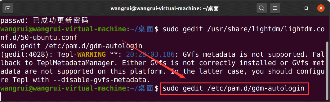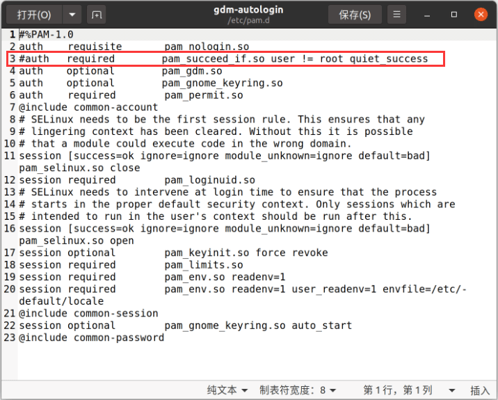 在终端输入命令:sudo gedit /etc/pam.d/gdm-autologin 打开文件