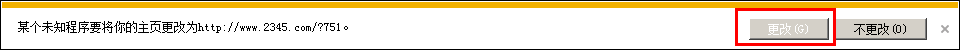 每次打开IE都提示“某个未知程序将你的主页更改为http://www.2345.com/?751。”,当然是点“不更改”,因为点的是“不更改 ”,所以每次打开IE都会提示。如图:
