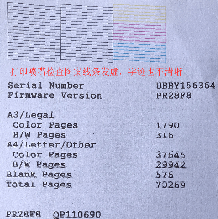 维修一台EPSON L1300喷墨打印机,打印出来的字每行只有上半部份,而且有些行还打印不出来。(没来得急拍下图片)