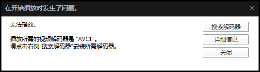 使用PotPlayer播放MP4提示“无法播放。播放所需的视频解码器是"AVC1"...”如图: