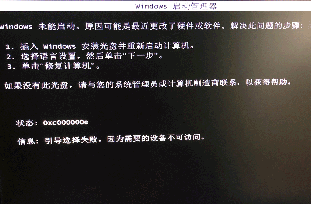 分析:因为磁盘处理脱机状态,所以系统在引导的时候找不到要引导的设备,从而报0xc000000e错误,信息也明确提示了设备不可访问。