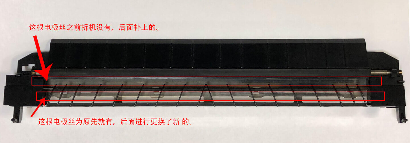 经检查后发现转印架上少了一条电极丝(转印电极丝),电极丝相关的配件全无。