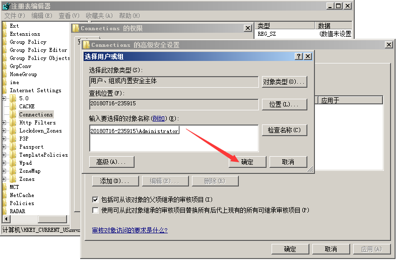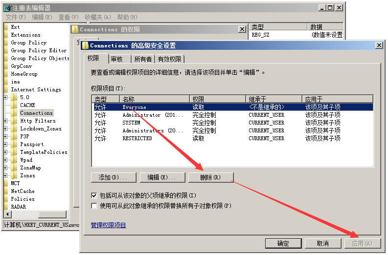 如果删除时提示 “无法删除所有指定的值。”,说明Connections项的权限被修改,导致当前用户没有操作权限。