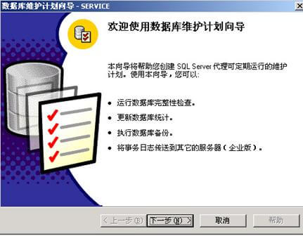 1、点击“开始”菜单->“程序”->“Microsoft SQL Server”->“企业管理器”,然后逐步展开“+”,直到出现“管理”,并展开它,然后选择“数据库维护计划”,单击右键,在弹出菜单中选择“新建维护计划”。整个过程可参看图6。