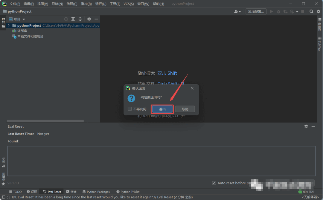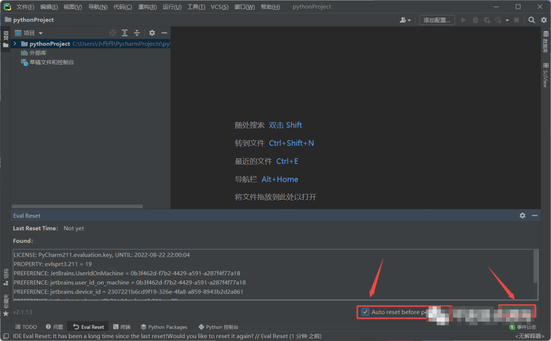 18.提示“IDE Eval Reset“,再次将”ide-eval-resetter-2.1.13”文件拖动到IPyCharm打开的界面中,点击“Restart“,程序将自动重启