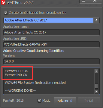 5. 选中后点击注册机右下角的Install,然后会跳出文件资源管理器让你找一个dll文件。如果是默认路径就打开C:\Program Files\Adobe\Adobe Photoshop CC 2018,找到后选择软件根目录下的amtlib.dll ,双击打开