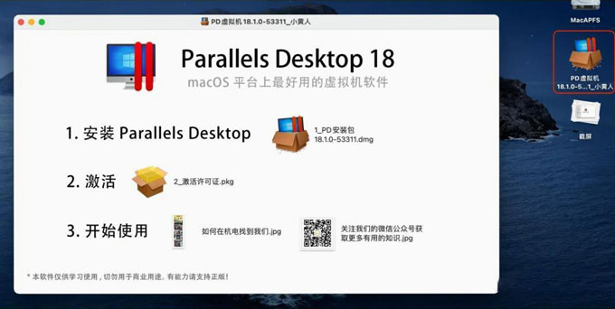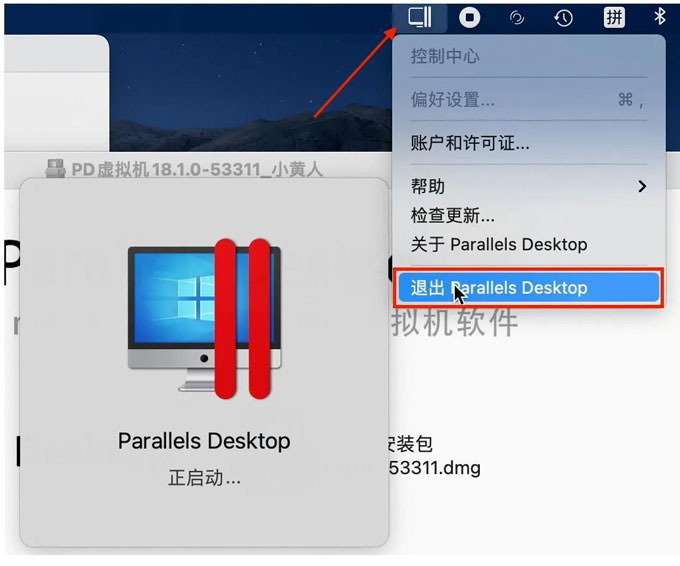 当你看到屏幕右上角的PD软件图标出现时,表示安装成功。但你需要先退出Parallels Desktop。