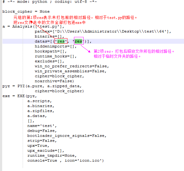编辑test.spec文件datas项,datas项中的元组功能参考如图: