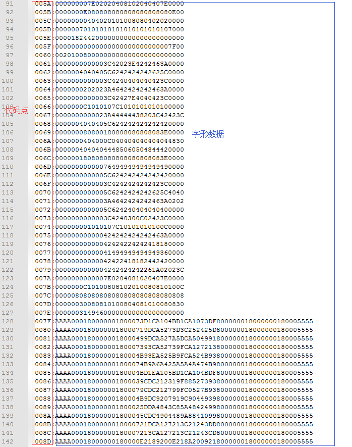 对于 16px * 16px 大小的字符,字形数据由32个十六进制数字组成,ASCII范围内的字符为 8px * 16px,原因是ASCII用宽度一半的像素就够表示了(宽 = 16/2 px),所以ASCII码可以由16个或者32个十六进制数字组成。