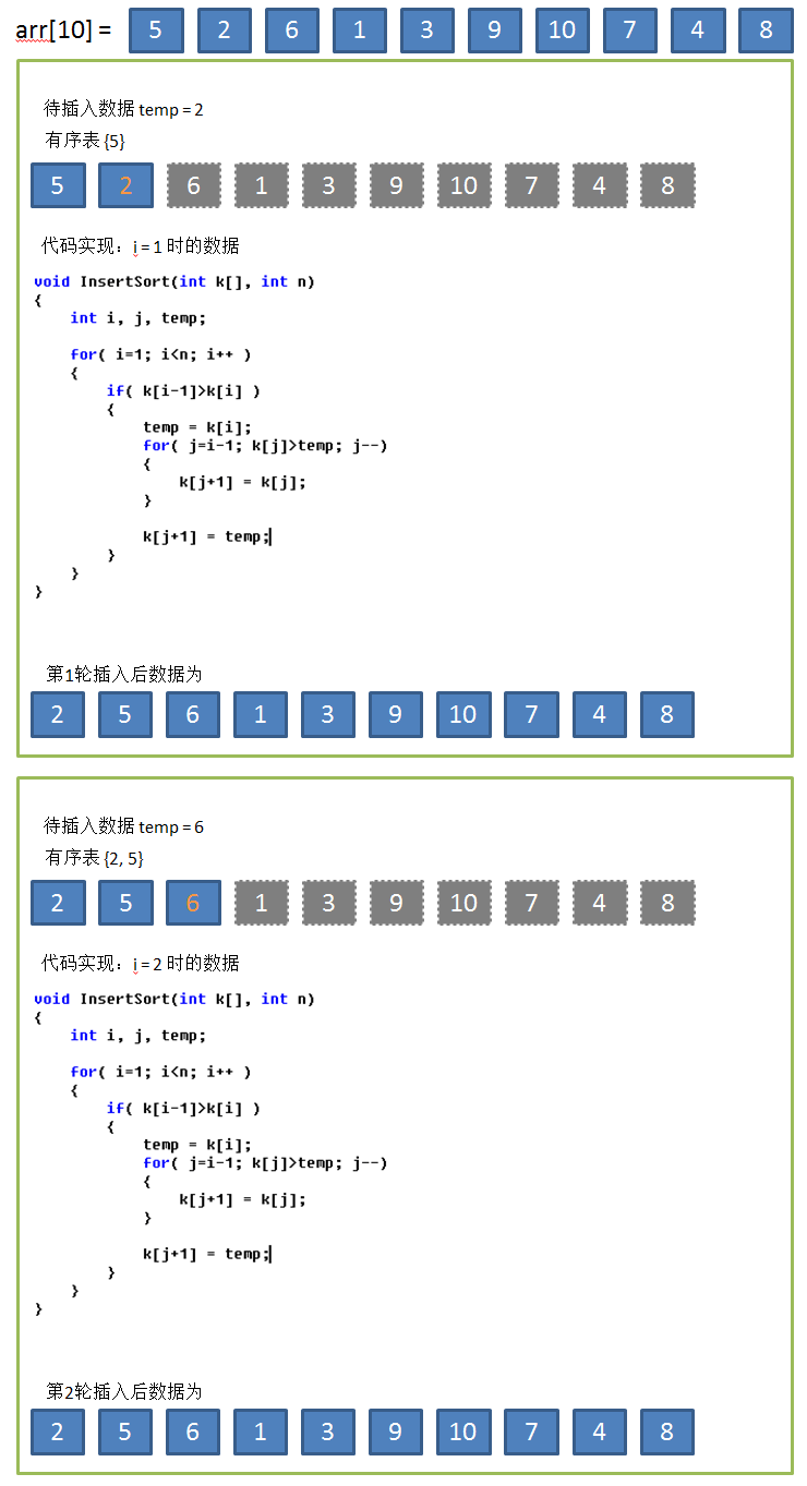 第1步:把数组的第0个元素看做一个有序表 {5}, 第1个元素看做待插入数据 2 ,插入后数组arr[10] = {2, 5, 6, 1, 3, 9, 10, 7, 4, 8};