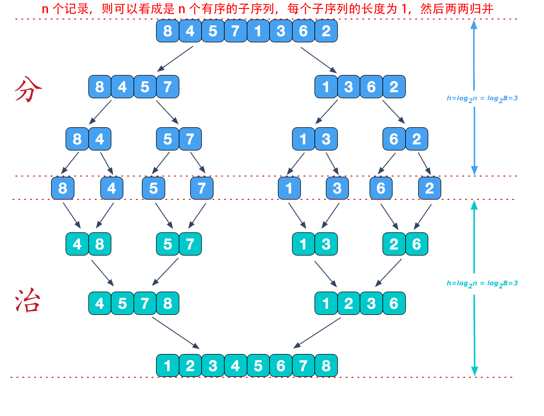 可以看到这种结构很像一棵完全二叉树,归并排序可以采用递归实现也可采用迭代的方式实现。分阶段可以理解为就是递归拆分子序列的过程,递归深度为log2n。