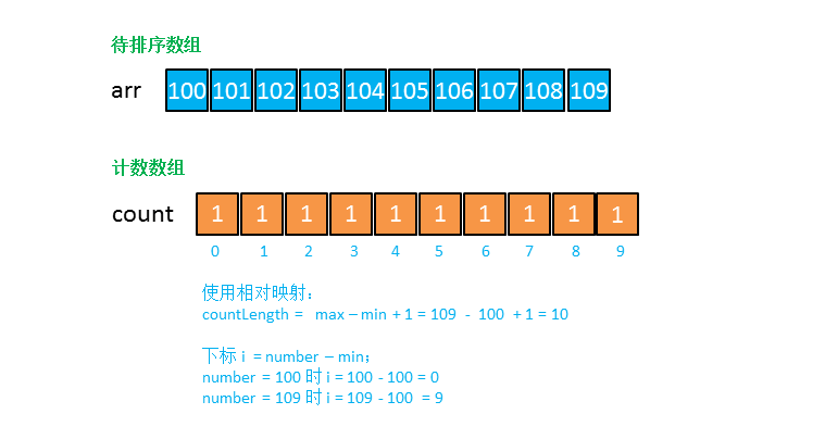 2. 实现相对映射。(公式:i = number - min;如例中的109,109在计数数组中的位置就是 i = 109 - 100 = 9)