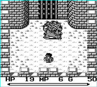 GameBoy 允许 4 种不同明度的灰色。观察这张来自 Final Fantasy Adventure 的截图。这是一个城堡,中间是草地,边上有一些散落的碎石,还有一只像老虎的怪物,战士穿着盔甲。所有这些都是由 4 个灰色画成的。(黑,白,2 个灰色)你可以试着自己画一样这个场景。注意场景中黑色的使用,黑色在这里被用来强调老虎和战士(以轮廓的形式),而草、碎石、城墙垛子都使用灰色勾边。还有草地,虽然很简单(点了几个点),但是有变化,有一个像素的草,也有两个像素的草,有高有低的草地生动了许多。