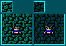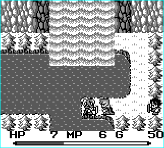 另一个场景,仍旧由 4 个灰色完成。其中还有一个瀑布的动画。观察岩石,有暗有亮……这是岩石峭壁,亮部的岩石使用灰色做为岩石与岩石相接部分的颜色,而暗部的岩石则用黑色。瀑布使用了抖动……没有使用黑色。树没有使用简单的渐变,而是根据树冠进行上明暗,黑色仅被用背光部树冠与树冠的交接处。如果这些物体都使用黑色勾边,那么他们会使怪物和玩家角色难以识别。