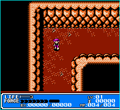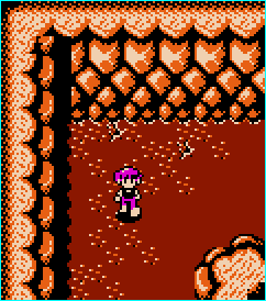 注意随意分布在岩石和地面上的杂点。杂点打破了岩石和地面的单调。岩石的图块在这里被反复使用……因为在早期受硬件限制美术没有太多的自由来考虑图块的细节。