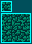 我想使岩石给人以古老的黑暗的感觉。但是并不如此,是不是哪出了问题?我使用了三个不同明度的绿色,并用明度最低的绿色填充背景。这样做没有带来预期的效果,反而看起来有点平……哪出了错么?在以前的游戏中,颜色数受限制,黑色被经常使用。黑色是一个关键的颜色。使用黑色可以反衬其他颜色,使之突出画面。如果你知道如何使用黑色,它将是一个很好的工具。举例子说在白色的纸上画画,人们用的最多的就是铅笔,而铅笔是黑色的。除了互补色,还有明度对比、纯度对比等等,所有这些基础的色彩知识在你画像素的时候都可以给你帮助。所以在这里我把背景色换成黑色并且把其他的绿色各降低一个明度。现在看看效果: