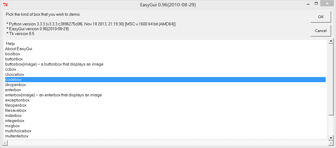 EasyGui 通过 exceptionbox() 函数提供了更好的方式去处理异常,异常出现的时候,exceptionbox() 会显示堆栈追踪在一个 codebox() 中并且允许你做进一步的处理。