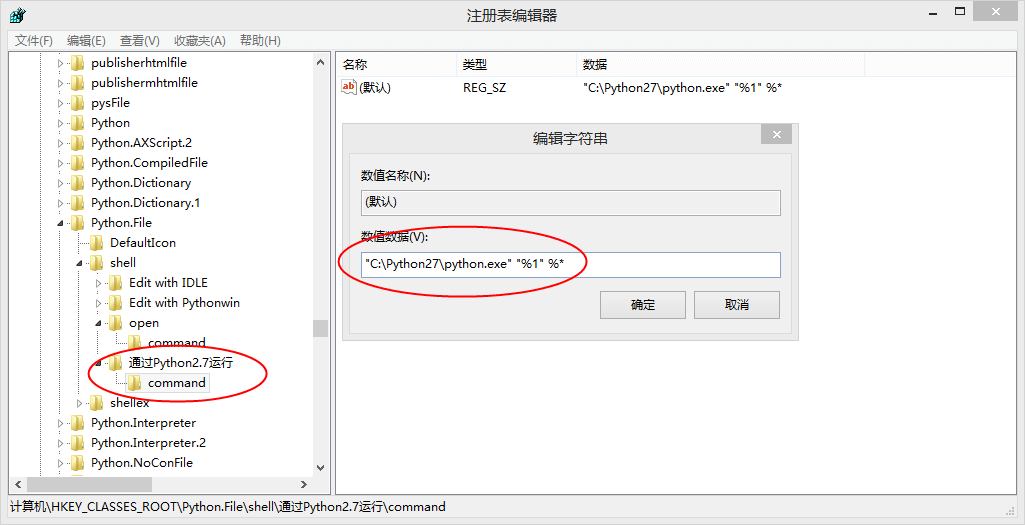 3. 双击(默认),将值改为: "C:\Python34\python.exe" "%1" %* 即可(这里我希望双击以 Python3.4 打开)。