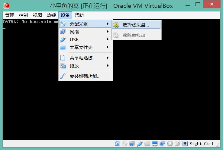10. 如果没有的话也没关系,点击“设备”->“分配光驱”->“选择虚拟盘”一样可以载入启动盘: