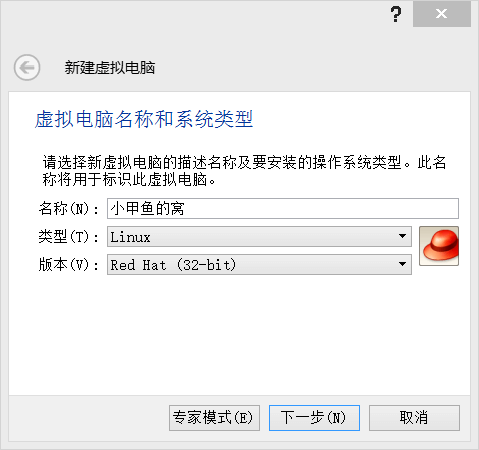 2. 名称:输入你想给虚拟机取的名字;类型:Linux;版本:Ret Hat(32-bit)