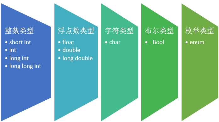 在 C 语言里,所谓的数据类型就是坑的大小。我们说变量就是在内存里边挖一个坑,然后给这个坑命名。那么数据类型指的就是这个坑的尺寸。C 语言允许使用的类型如下: