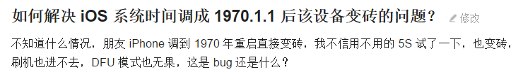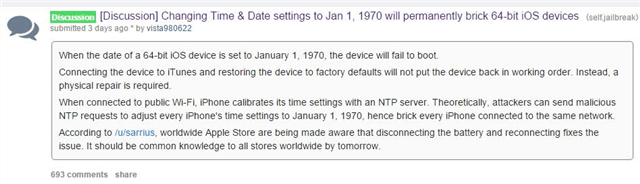日前有消息称,把 iOS 设备日期设置为 1970 年 1 月 1 日,重启后就会变砖。很多好奇网友尝试后中招。