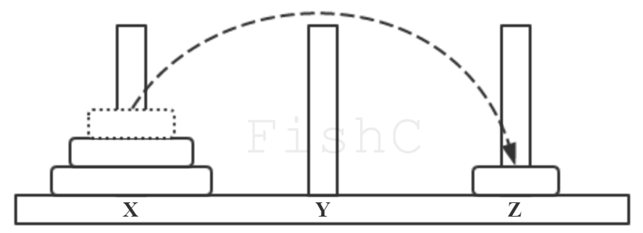 在游戏中,由于每次只能移动一个圆盘,所以在移动的过程中显然要借助另外一根针才可以实施。也就是说,步骤 1 将 1~63 个盘子移到 Y 上,需要借助 Z;步骤 3 将 Y 针上的 63 个盘子移到 Z 针上,需要借助 X。