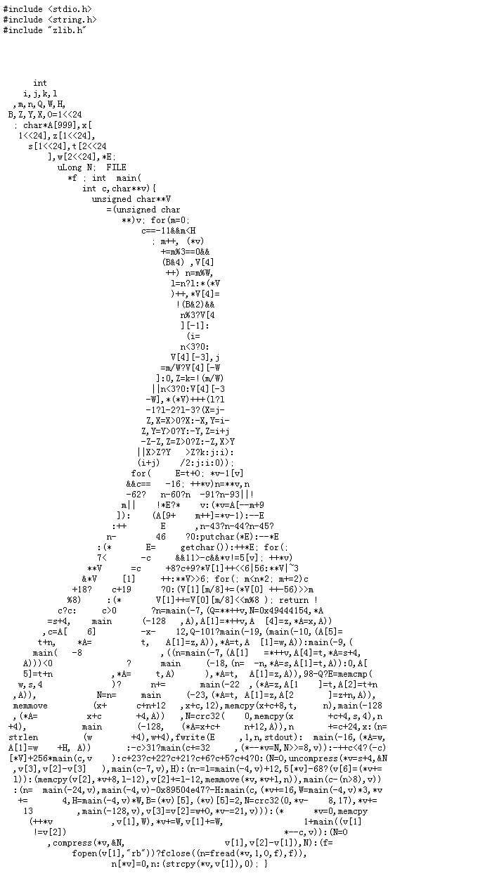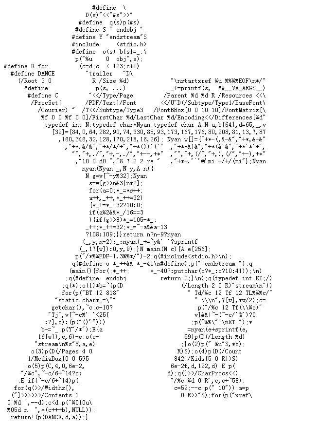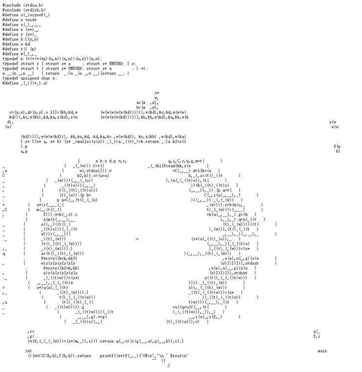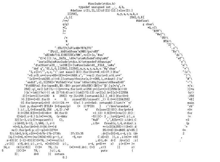 为此,还有组织每年举办一次国际 C 语言混乱代码大赛(IOCCC),举办至今已经有二十几届了,都是世界顶级 C 语言开发者的娱乐作品,贴几个给大家观赏下: