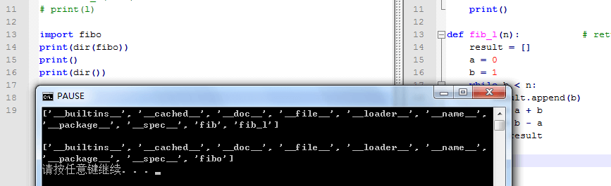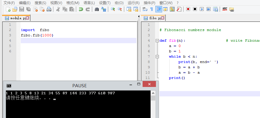 新建一 .py 文件,如 module.py( 与 fibo.py 同一目录),引用 fibo import fibo ,执行 fibo下的 fib 函数 fibo.fib(1000) (即输出1000 内的 fibonacci数列),参见下方截图