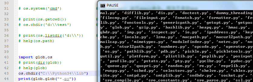 参考下例, glob.glob("*.py") 返回了所有当前工作目录(已改为"C:\Python34\Lib")下,通配 ".py" 的文件;也可以指定绝对路径,如 print(glob.glob("C:\\Python34\\Lib\\*.py"))