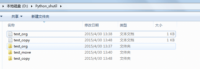 为演示复制、移动操作,我们在该文件夹下手动操作 新建文件夹 test_org、 test_copy 及 test_move; 新建文件 test.txt test1.txt , 两者内容不同