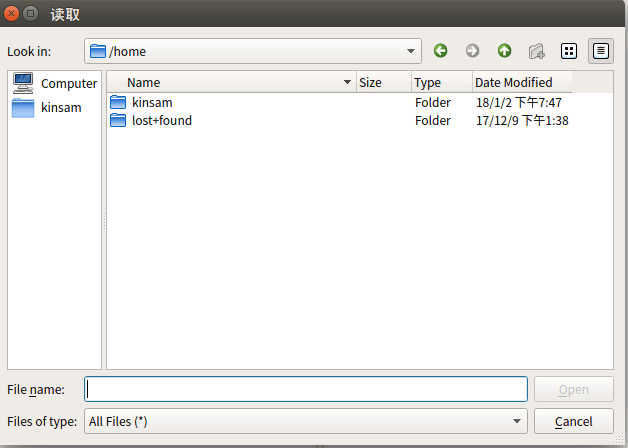file_name,ok=QFileDialog.getOpenFileName(self,'读取','/home')