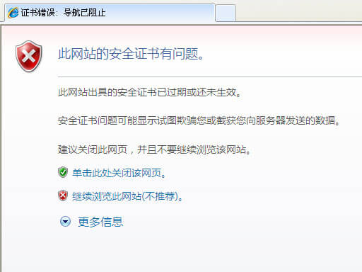 出现该问题的原因是:网站证书都有个 有效期 如果时间不在有效期范围内就会提示此网站的安全证书有问题 PS:其实如果系统时间的年份过小或者过大都会导至很多程序不能正常运行