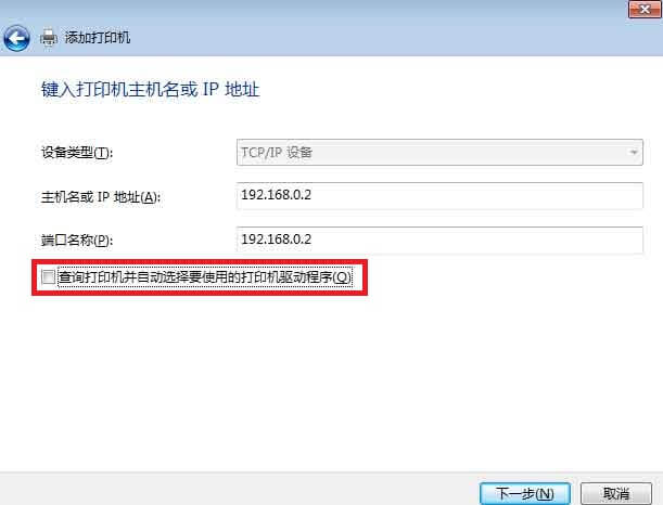 3、输入打印机的IP-〉关键去掉勾选“查询打印机并自动选择要使用的打印机驱动程序”-〉“下一步”