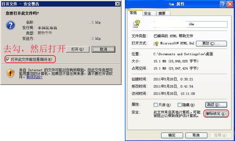 解决方法二: 右键chm文件或hlp文件,然后单击“属性”; 单击“取消阻止”或者选“解除锁定”。