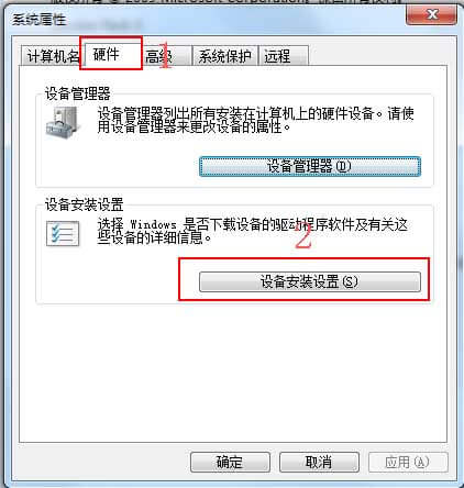 3:在弹出的系统属性菜单中,选择“硬件”标签;并单击“设备安装设置”,如图所示: